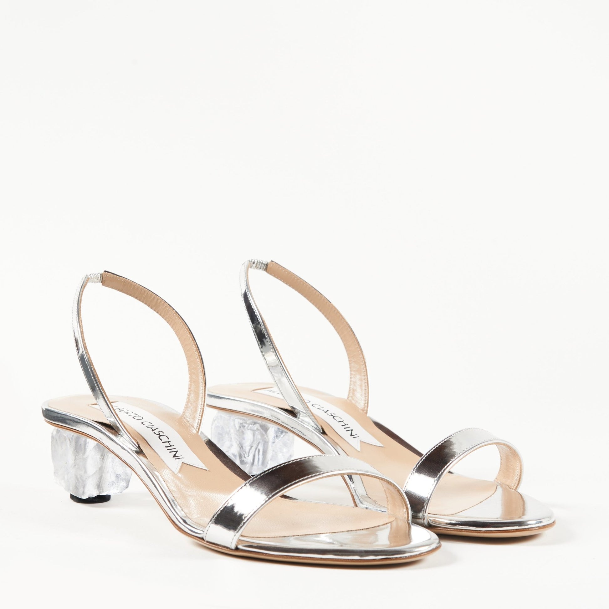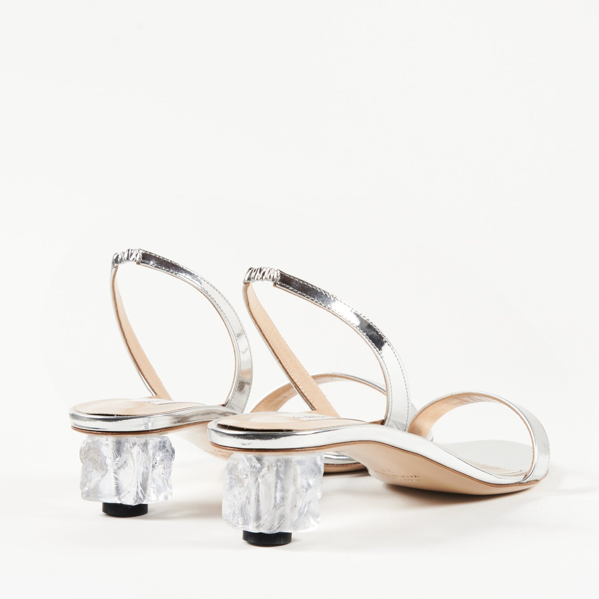 Elegant and refined, the silver mirror leather sandal with ice cube heel will be your elegant companion for this summer. Bright as a mirror and fresh as an ice cube, it will make you shine on every occasion. Perfect for those looking for an elegant and contemporary look.