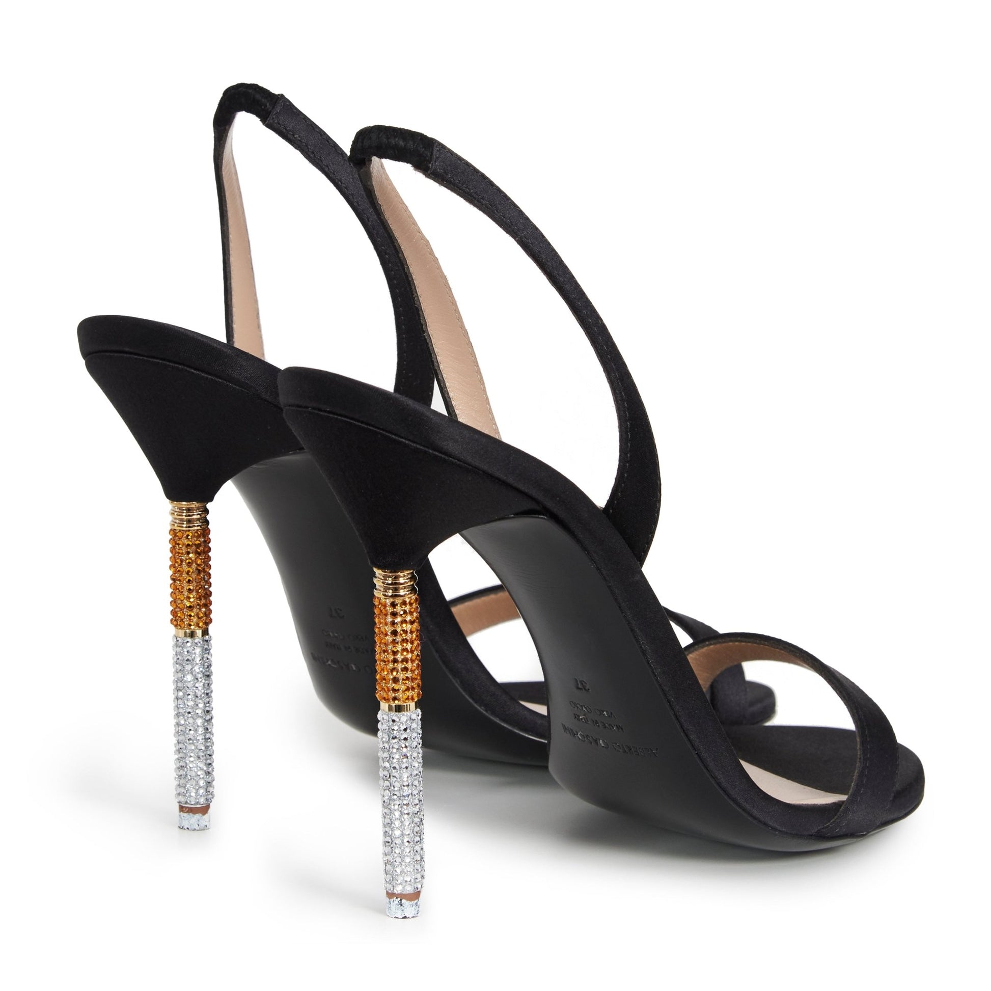 Sandalo in prezioso satin realizzato a mano in Italia, dal design minimale, con doppi listini, sulla punta e dietro il tallone, caratterizzato da un tacco a sigaretta decorato con strass scintillanti che cattureranno lo sguardo di ogni tuo passo!