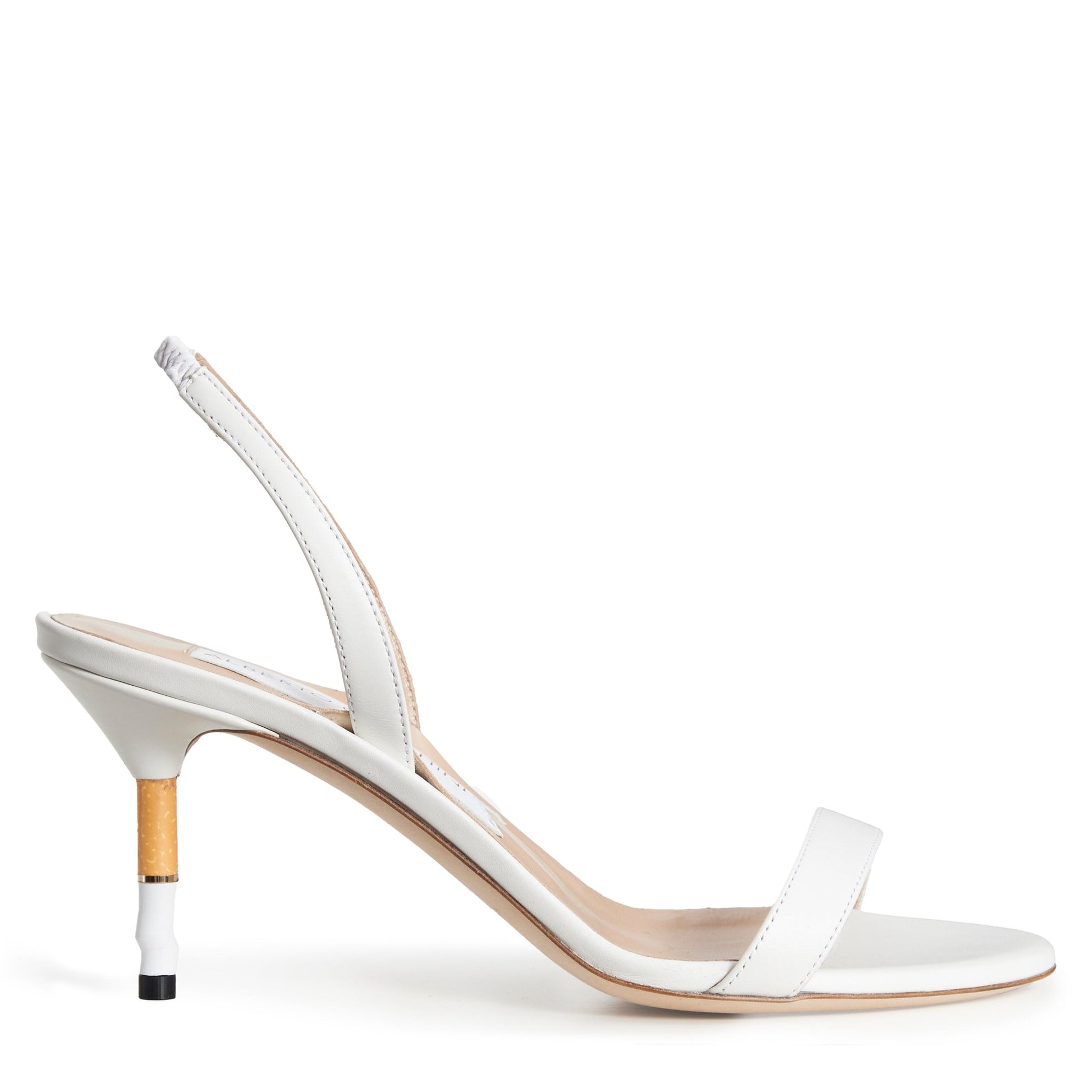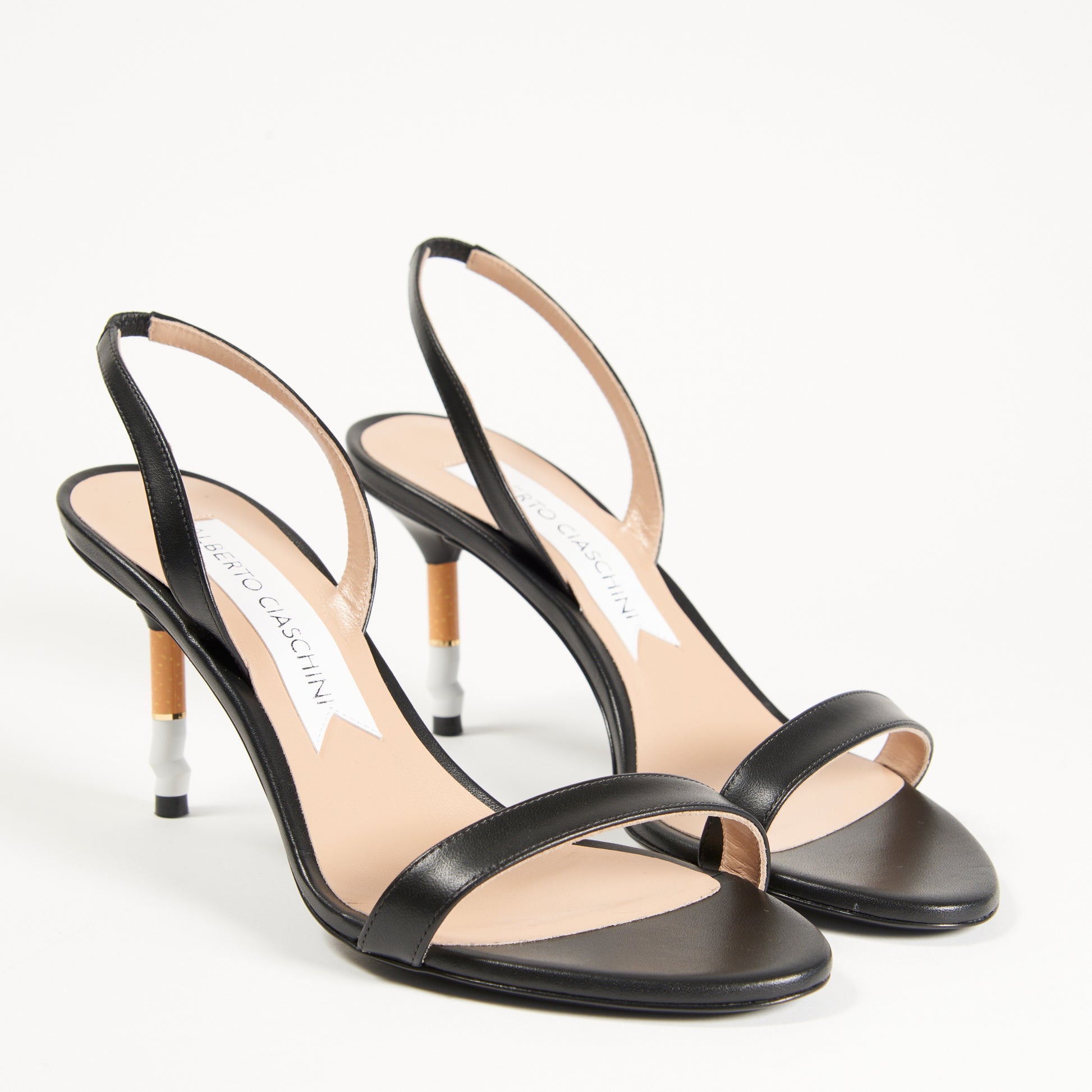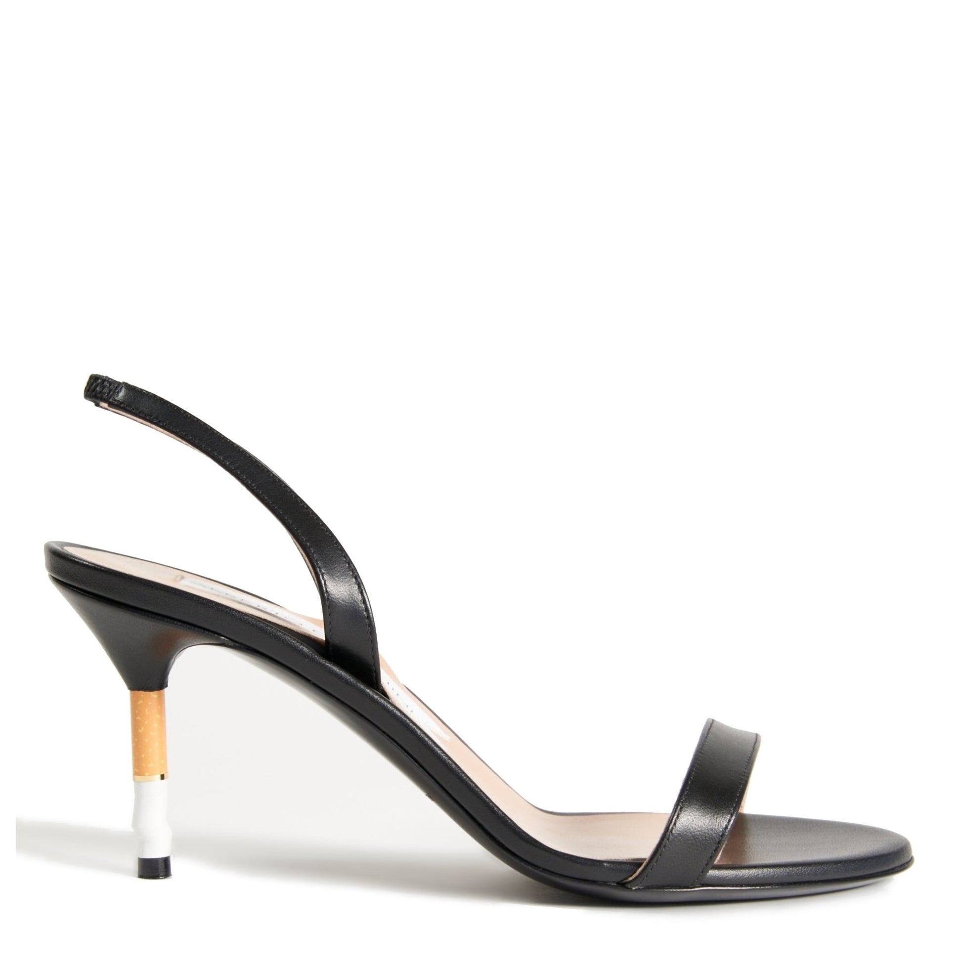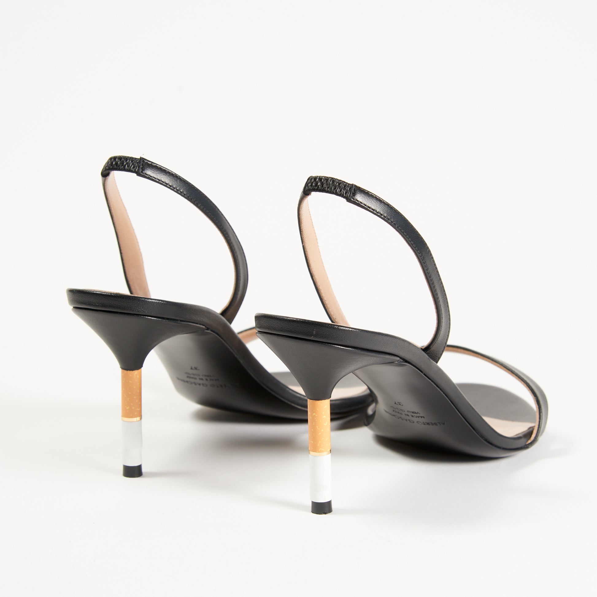 Sandalo dal design minimal in morbida pelle nera con tacco a forma di sigaretta spenta. L'accessorio perfetto per un look unico e di tendenza. Il tacco aggiunge un tocco di originalità e ironia al tuo outfit.